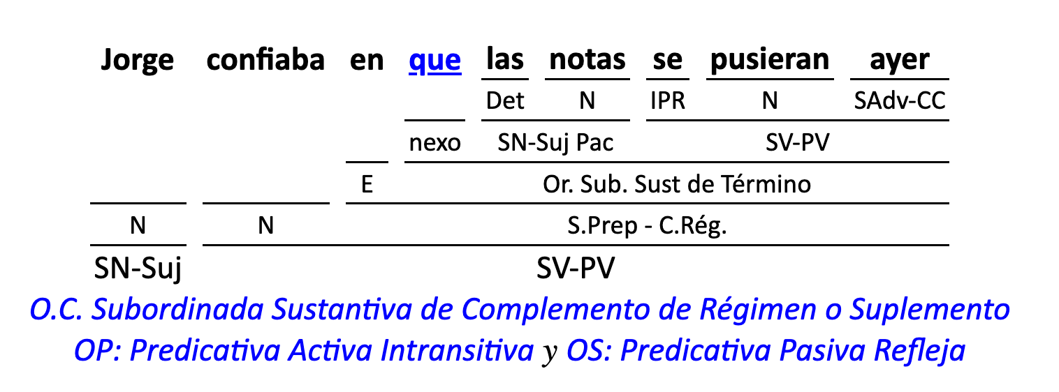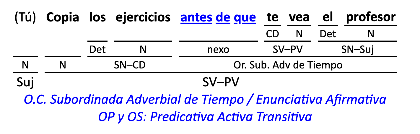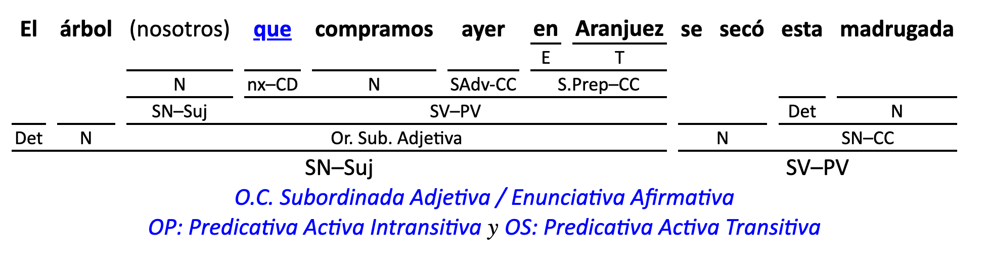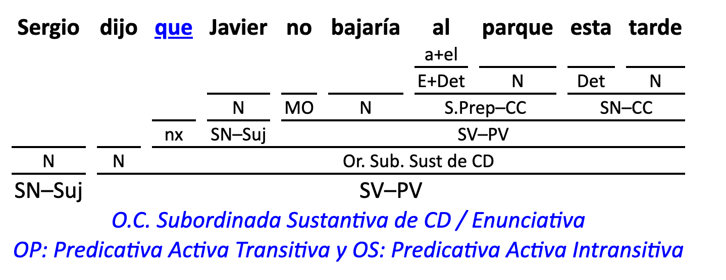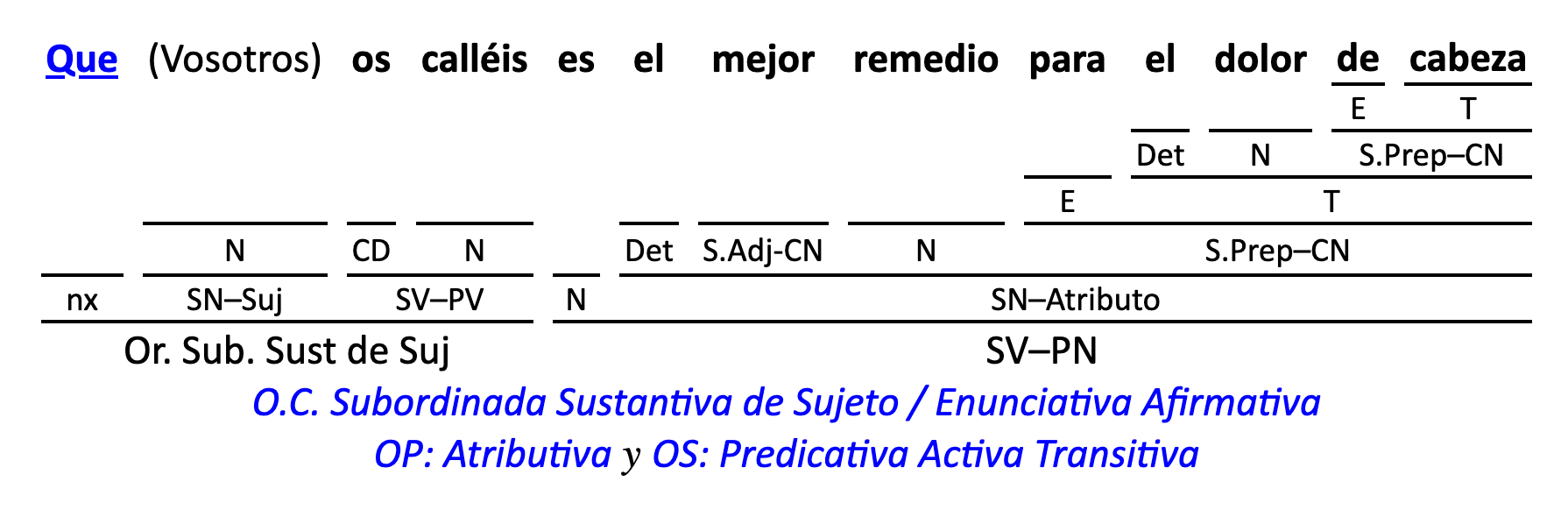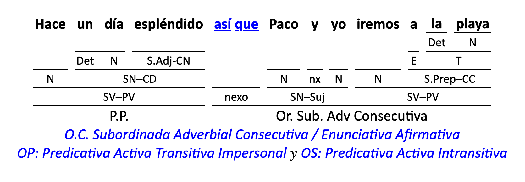 Leyenda: SN (sintagma nominal) / S.Prep. (sintagma preposicional, es una preposición a la que le sigue un Término, generalmente un SN) / Det (Determinante, está siempre dentro de un SN o S.Prep) / N (núcleo del grupo sintáctico) / CN (complemento del nombre, sin especificar si es adyacente, en aposición, etc.) / S.Adj (sintagma adjetival) / S.Adv (sintagma adverbial) / C.Rég (complemento de régimen) / C.Pvo ó C.Pred (complemento predicativo; si es de CD se añade «de CD») / CC (complemento circunstancial, sin especificar la circunstancia) / SN-SUJ (sintagma nominal sujeto; si fuera sujeto paciente se especifica SUJ PAC) / C.Ag. (complemento agente) / SV-PV (sintagma verbal, predicado verbal) / SV-PN (sintagma verbal, predicado nominal) / E (enlace, son preposiciones) / NX ó nexo (nexos, conjunciones o elementos que enlazan proposiciones) / C.Adj (complemento del adjetivo) / C.Adv (complemento del adverbio) / IPR (indicador de pasiva refleja) / I.I. (indicador de impersonalidad) / O.S. (oración simple) O.C. (oración compuesta) / O.P. (oración principal) / O.S. (oración subordinada)