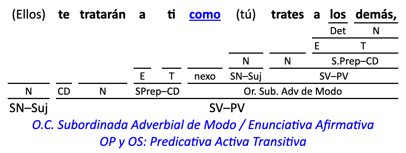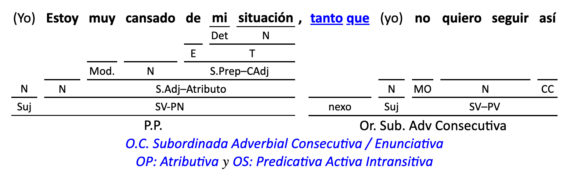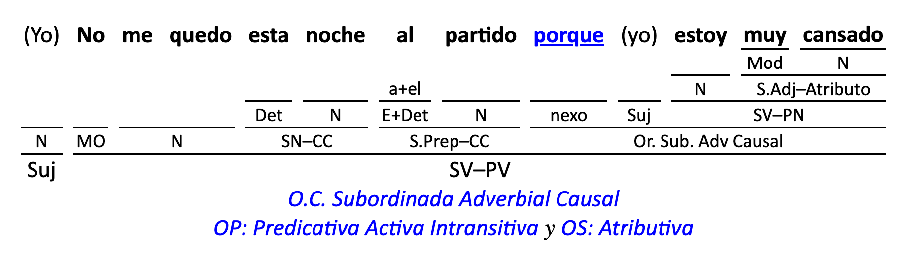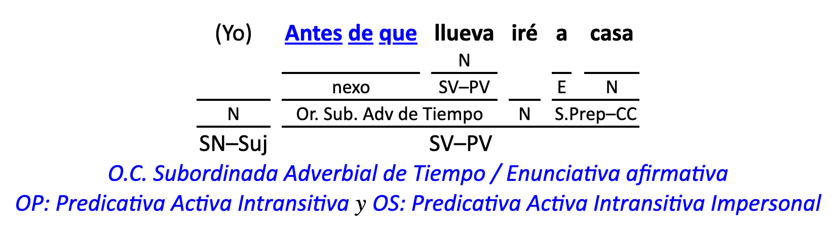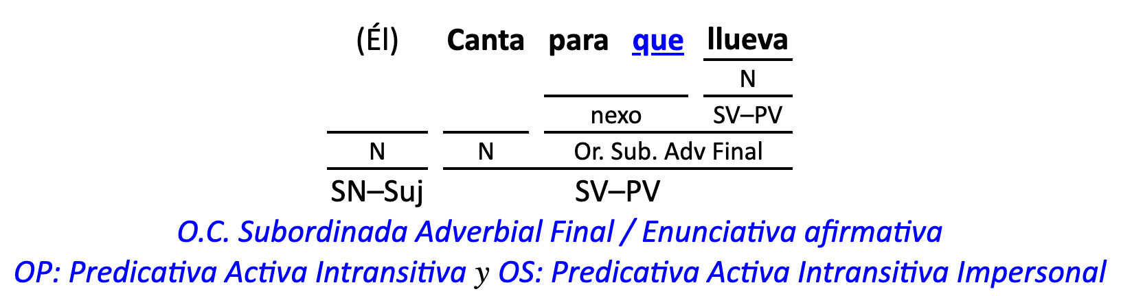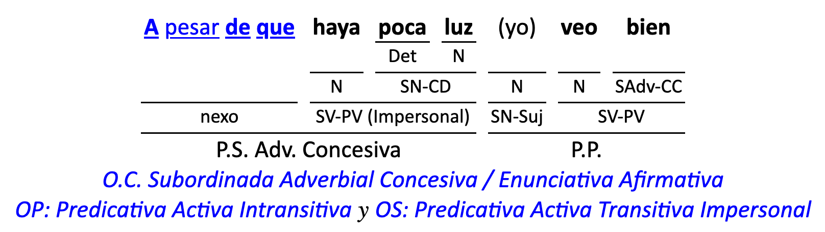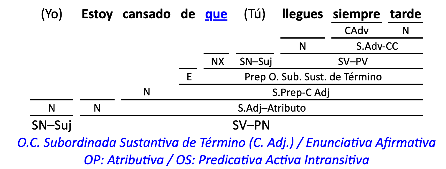 Leyenda: SN (sintagma nominal) / S.Prep. (sintagma preposicional, es una preposición a la que le sigue un Término, generalmente un SN) / Det (Determinante, está siempre dentro de un SN o S.Prep) / N (núcleo del grupo sintáctico) / CN (complemento del nombre, sin especificar si es adyacente, en aposición, etc.) / S.Adj (sintagma adjetival) / S.Adv (sintagma adverbial) / C.Rég (complemento de régimen) / C.Pvo ó C.Pred (complemento predicativo; si es de CD se añade «de CD») / CC (complemento circunstancial, sin especificar la circunstancia) / SN-SUJ (sintagma nominal sujeto; si fuera sujeto paciente se especifica SUJ PAC) / C.Ag. (complemento agente) / SV-PV (sintagma verbal, predicado verbal) / SV-PN (sintagma verbal, predicado nominal) / E (enlace, son preposiciones) / NX ó nexo (nexos, conjunciones o elementos que enlazan proposiciones) / C.Adj (complemento del adjetivo) / C.Adv (complemento del adverbio) / IPR (indicador de pasiva refleja) / I.I. (indicador de impersonalidad) / O.S. (oración simple) O.C. (oración compuesta) / O.P. (oración principal) / O.S. (oración subordinada)