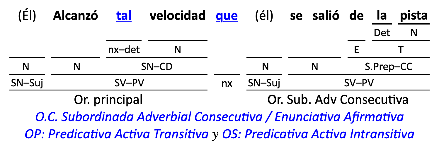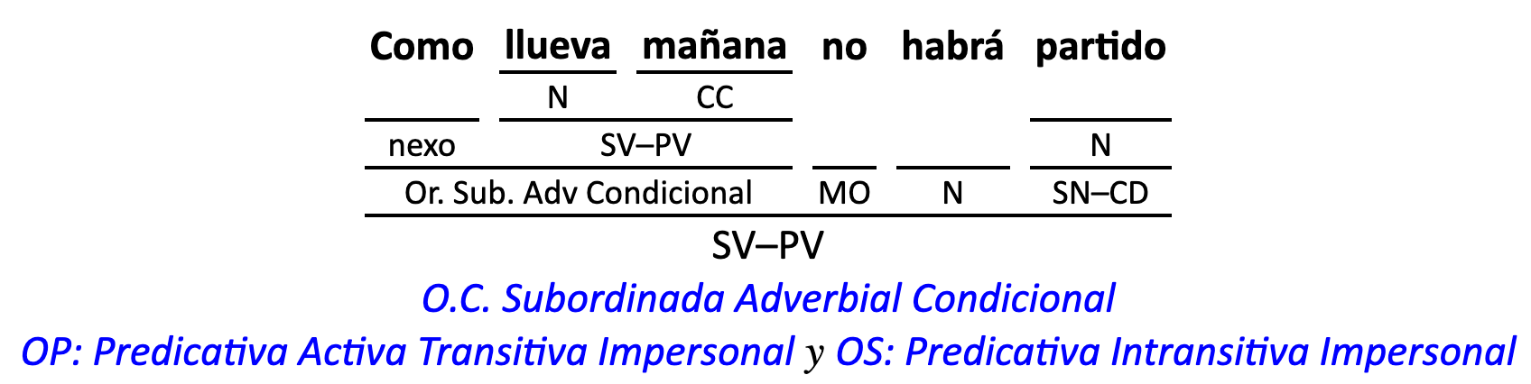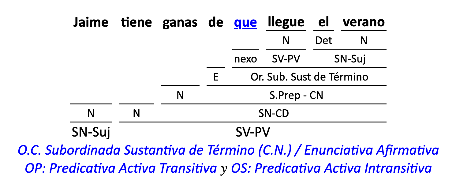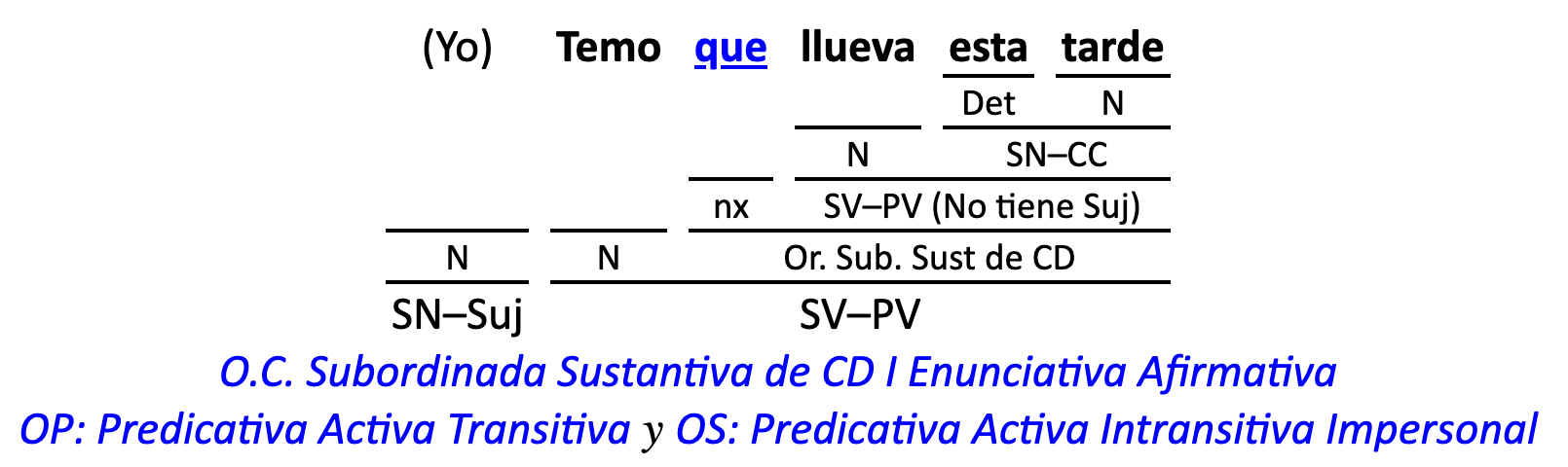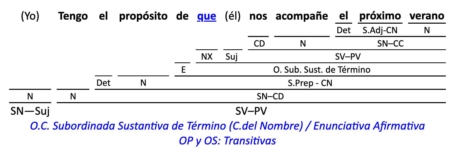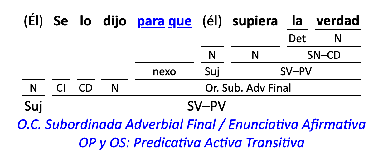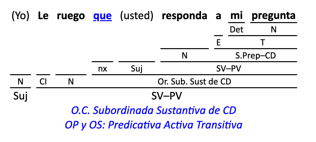 Leyenda: SN (sintagma nominal) / S.Prep. (sintagma preposicional, es una preposición a la que le sigue un Término, generalmente un SN) / Det (Determinante, está siempre dentro de un SN o S.Prep) / N (núcleo del grupo sintáctico) / CN (complemento del nombre, sin especificar si es adyacente, en aposición, etc.) / S.Adj (sintagma adjetival) / S.Adv (sintagma adverbial) / C.Rég (complemento de régimen) / C.Pvo ó C.Pred (complemento predicativo; si es de CD se añade «de CD») / CC (complemento circunstancial, sin especificar la circunstancia) / SN-SUJ (sintagma nominal sujeto; si fuera sujeto paciente se especifica SUJ PAC) / C.Ag. (complemento agente) / SV-PV (sintagma verbal, predicado verbal) / SV-PN (sintagma verbal, predicado nominal) / E (enlace, son preposiciones) / NX ó nexo (nexos, conjunciones o elementos que enlazan proposiciones) / C.Adj (complemento del adjetivo) / C.Adv (complemento del adverbio) / IPR (indicador de pasiva refleja) / I.I. (indicador de impersonalidad) / O.S. (oración simple) O.C. (oración compuesta) / O.P. (oración principal) / O.S. (oración subordinada)