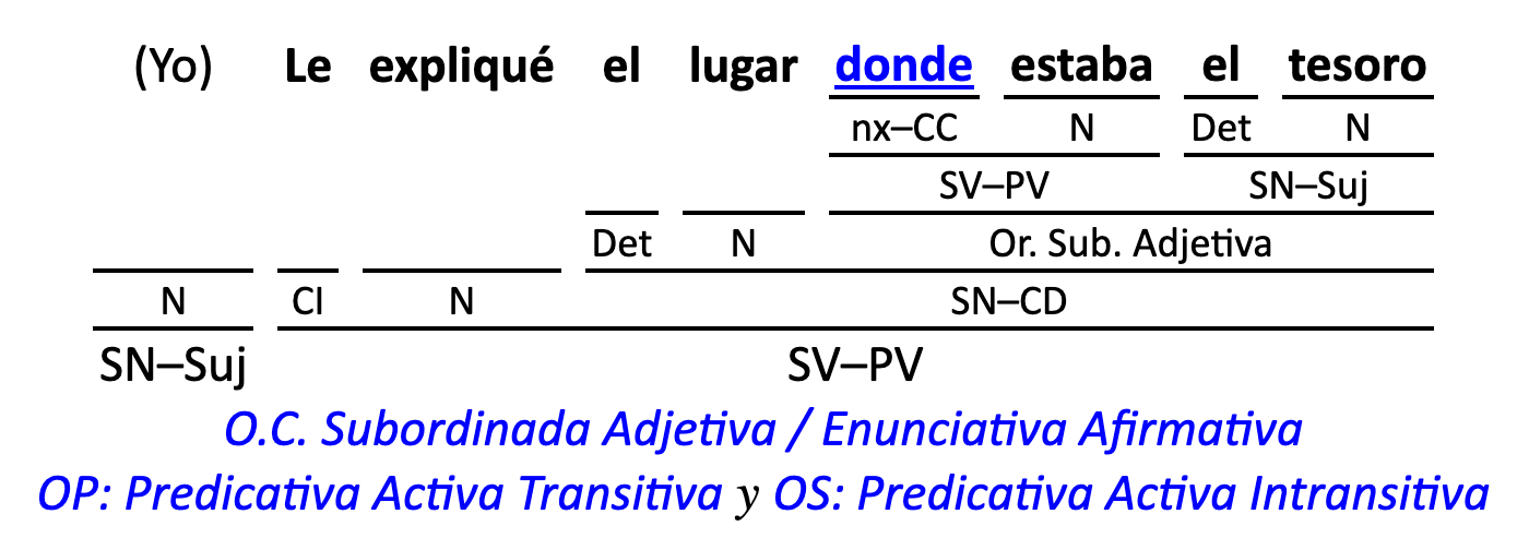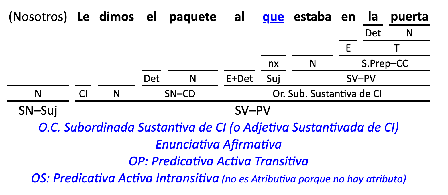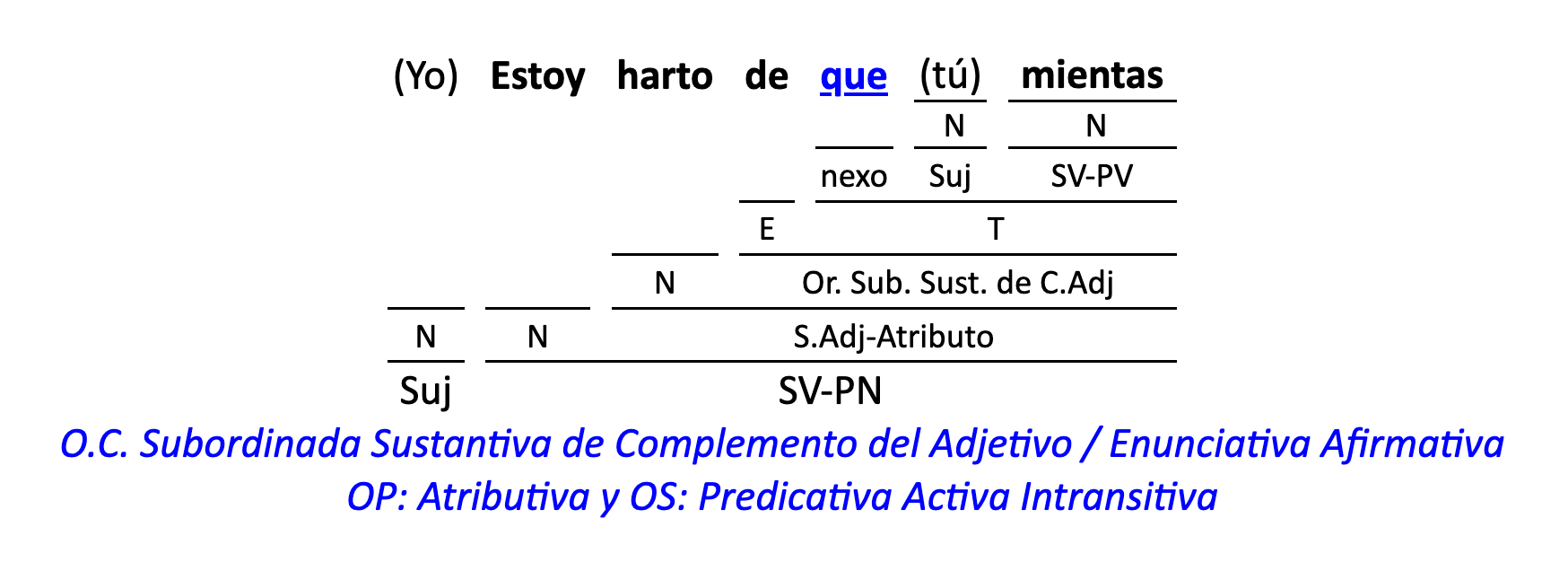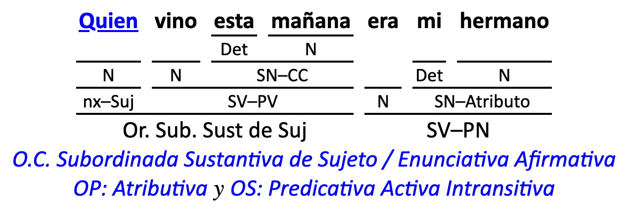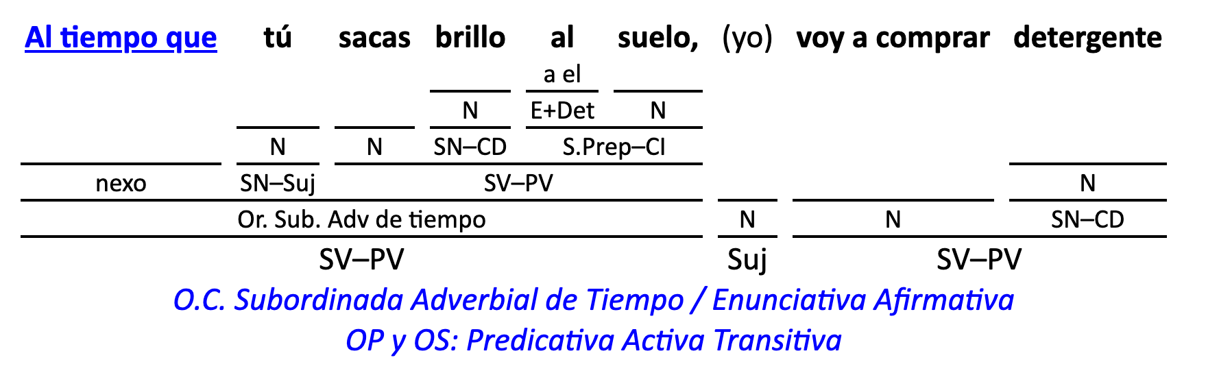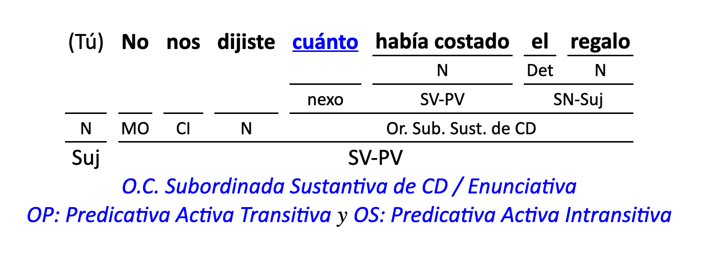 Leyenda: SN (sintagma nominal) / S.Prep. (sintagma preposicional, es una preposición a la que le sigue un Término, generalmente un SN) / Det (Determinante, está siempre dentro de un SN o S.Prep) / N (núcleo del grupo sintáctico) / CN (complemento del nombre, sin especificar si es adyacente, en aposición, etc.) / S.Adj (sintagma adjetival) / S.Adv (sintagma adverbial) / C.Rég (complemento de régimen) / C.Pvo ó C.Pred (complemento predicativo; si es de CD se añade «de CD») / CC (complemento circunstancial, sin especificar la circunstancia) / SN-SUJ (sintagma nominal sujeto; si fuera sujeto paciente se especifica SUJ PAC) / C.Ag. (complemento agente) / SV-PV (sintagma verbal, predicado verbal) / SV-PN (sintagma verbal, predicado nominal) / E (enlace, son preposiciones) / NX ó nexo (nexos, conjunciones o elementos que enlazan proposiciones) / C.Adj (complemento del adjetivo) / C.Adv (complemento del adverbio) / IPR (indicador de pasiva refleja) / I.I. (indicador de impersonalidad) / O.S. (oración simple) O.C. (oración compuesta) / O.P. (oración principal) / O.S. (oración subordinada)