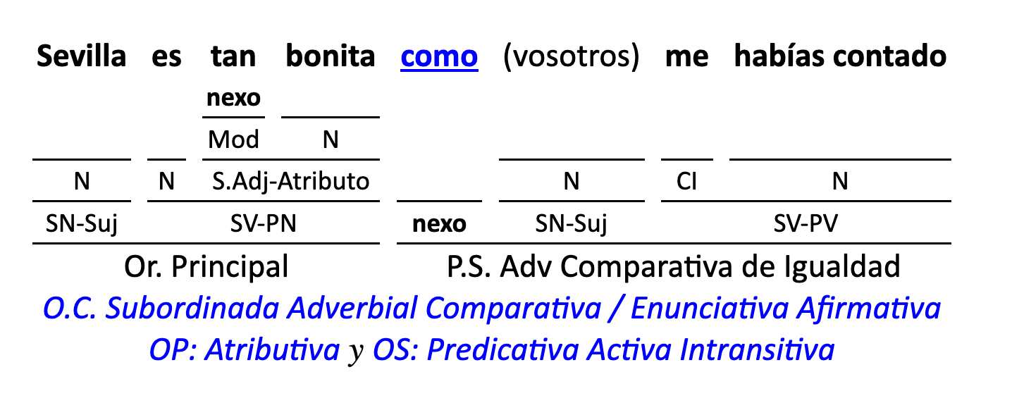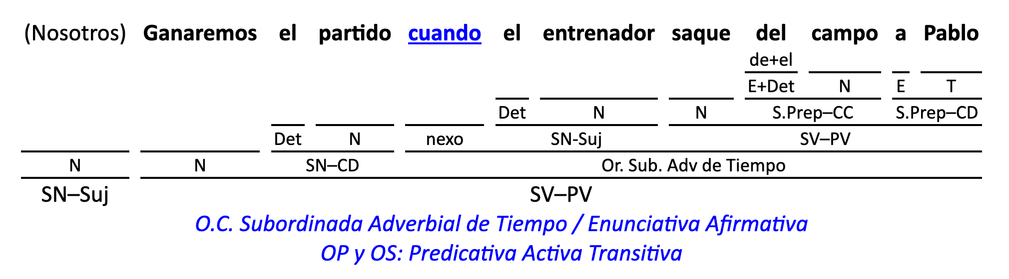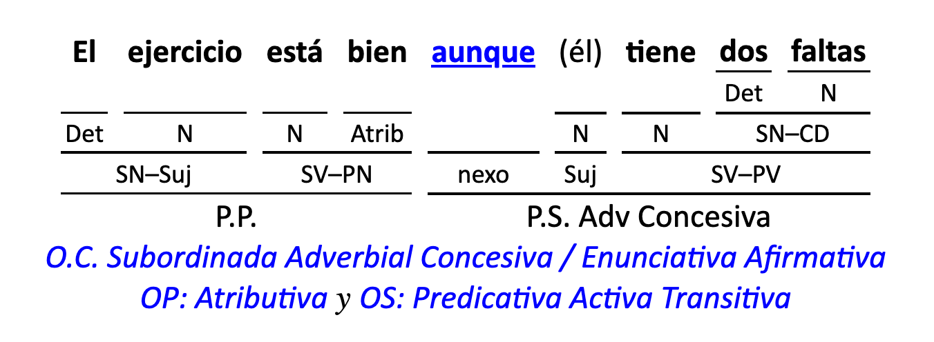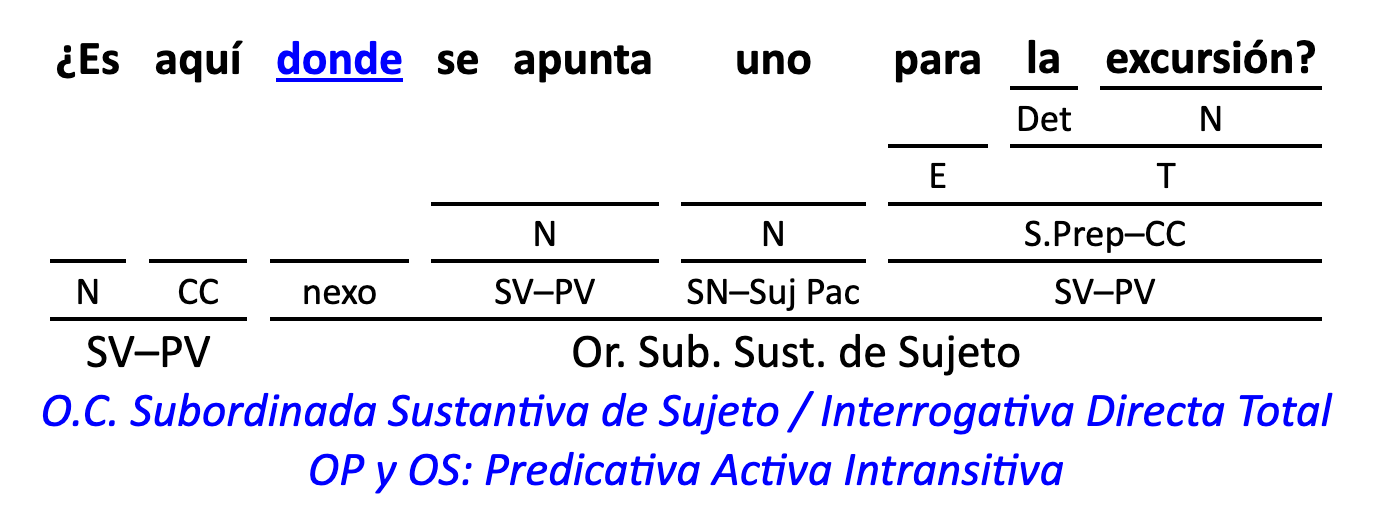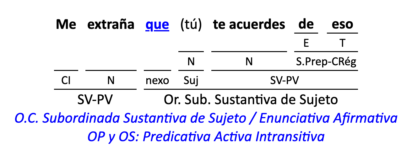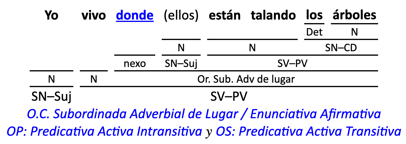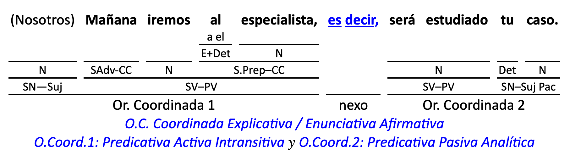 Leyenda: SN (sintagma nominal) / S.Prep. (sintagma preposicional, es una preposición a la que le sigue un Término, generalmente un SN) / Det (Determinante, está siempre dentro de un SN o S.Prep) / N (núcleo del grupo sintáctico) / CN (complemento del nombre, sin especificar si es adyacente, en aposición, etc.) / S.Adj (sintagma adjetival) / S.Adv (sintagma adverbial) / C.Rég (complemento de régimen) / C.Pvo ó C.Pred (complemento predicativo; si es de CD se añade «de CD») / CC (complemento circunstancial, sin especificar la circunstancia) / SN-SUJ (sintagma nominal sujeto; si fuera sujeto paciente se especifica SUJ PAC) / C.Ag. (complemento agente) / SV-PV (sintagma verbal, predicado verbal) / SV-PN (sintagma verbal, predicado nominal) / E (enlace, son preposiciones) / NX ó nexo (nexos, conjunciones o elementos que enlazan proposiciones) / C.Adj (complemento del adjetivo) / C.Adv (complemento del adverbio) / IPR (indicador de pasiva refleja) / I.I. (indicador de impersonalidad) / O.S. (oración simple) O.C. (oración compuesta) / O.P. (oración principal) / O.S. (oración subordinada)
