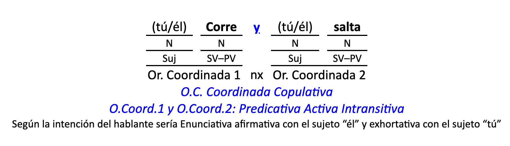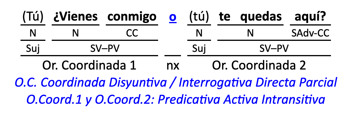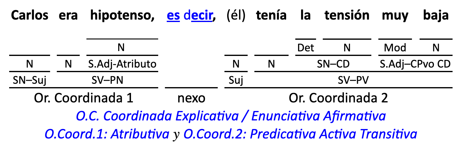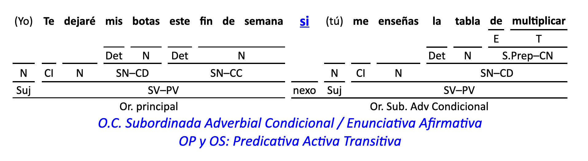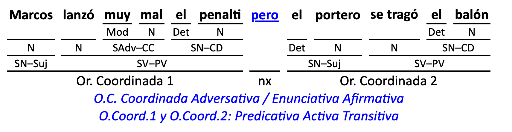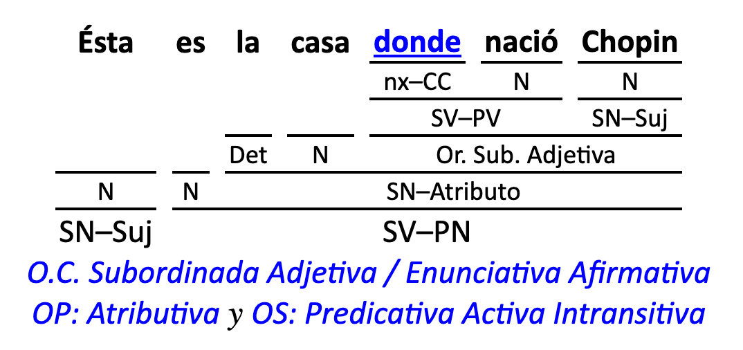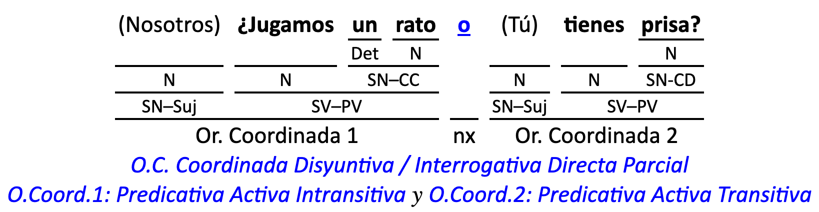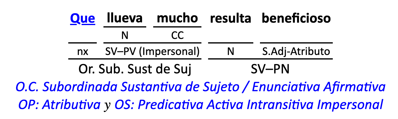 Leyenda: SN (sintagma nominal) / S.Prep. (sintagma preposicional, es una preposición a la que le sigue un Término, generalmente un SN) / Det (Determinante, está siempre dentro de un SN o S.Prep) / N (núcleo del grupo sintáctico) / CN (complemento del nombre, sin especificar si es adyacente, en aposición, etc.) / S.Adj (sintagma adjetival) / S.Adv (sintagma adverbial) / C.Rég (complemento de régimen) / C.Pvo ó C.Pred (complemento predicativo; si es de CD se añade «de CD») / CC (complemento circunstancial, sin especificar la circunstancia) / SN-SUJ (sintagma nominal sujeto; si fuera sujeto paciente se especifica SUJ PAC) / C.Ag. (complemento agente) / SV-PV (sintagma verbal, predicado verbal) / SV-PN (sintagma verbal, predicado nominal) / E (enlace, son preposiciones) / NX ó nexo (nexos, conjunciones o elementos que enlazan proposiciones) / C.Adj (complemento del adjetivo) / C.Adv (complemento del adverbio) / IPR (indicador de pasiva refleja) / I.I. (indicador de impersonalidad) / O.S. (oración simple) O.C. (oración compuesta) / O.P. (oración principal) / O.S. (oración subordinada)